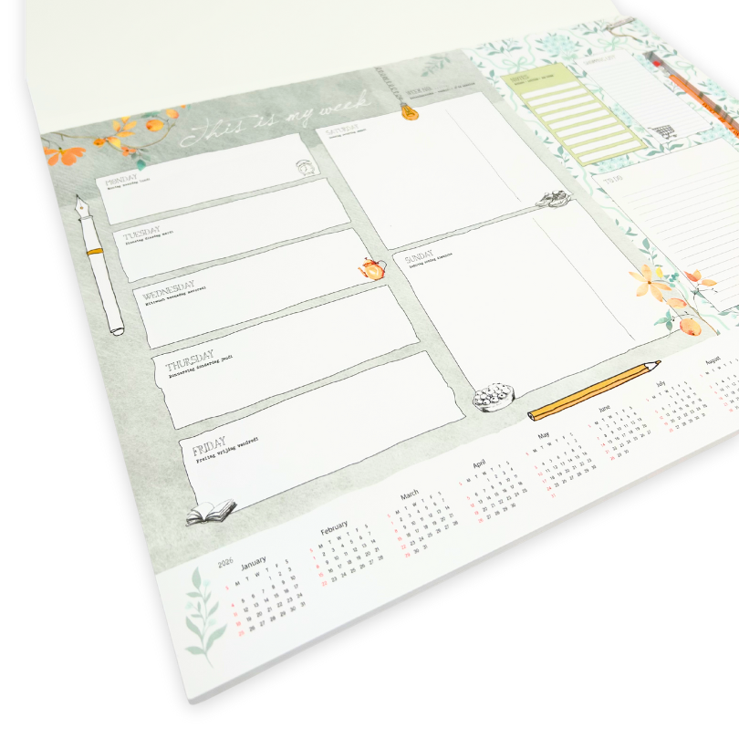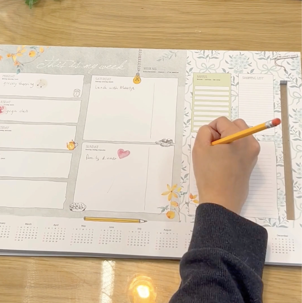 This planner helps you organize your days with pleasure. With its large format (42 x 30 cm) and 52 beautifully designed pages—one for each week of the year—you have plenty of space to keep track of your schedule from Monday to Sunday. There is even extra writing space for the weekend, the best days of the week!