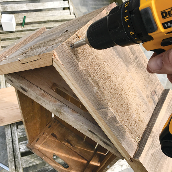Divide the wooden crate into different sections using planks of wood. These will be the various rooms. Fill each area with a natural material. Drill some holes for the bees. Now just add a roof and your B&B is ready for its first visitors!